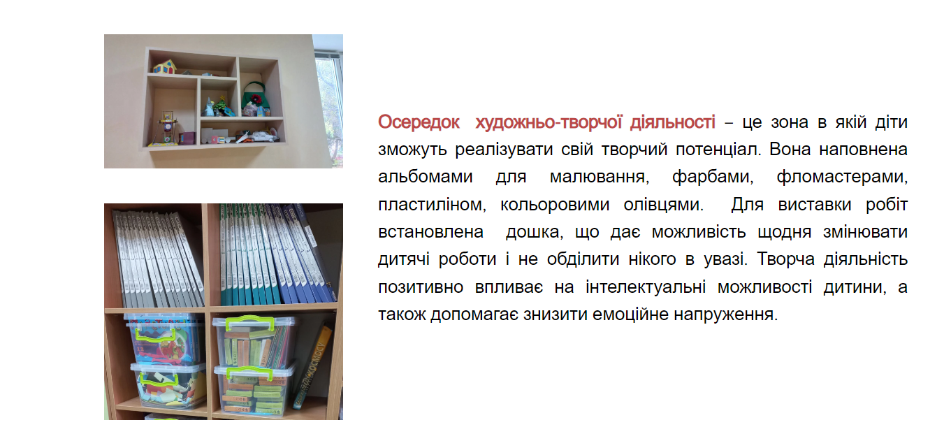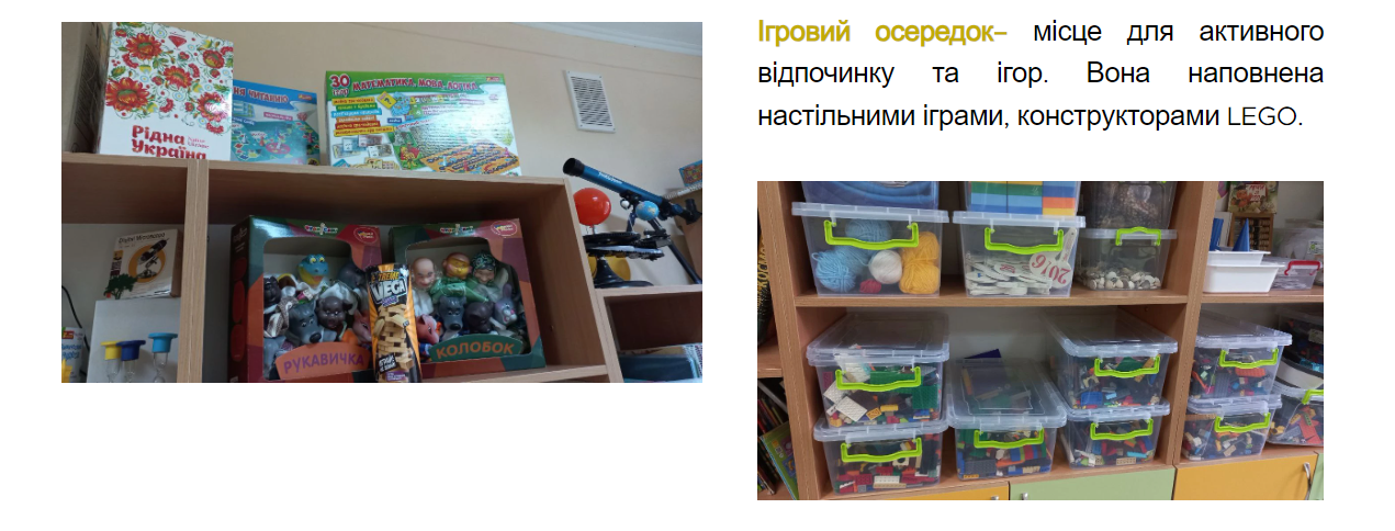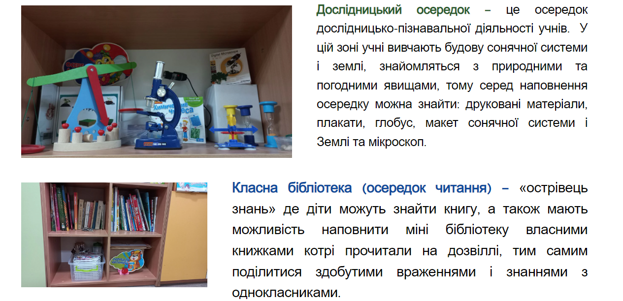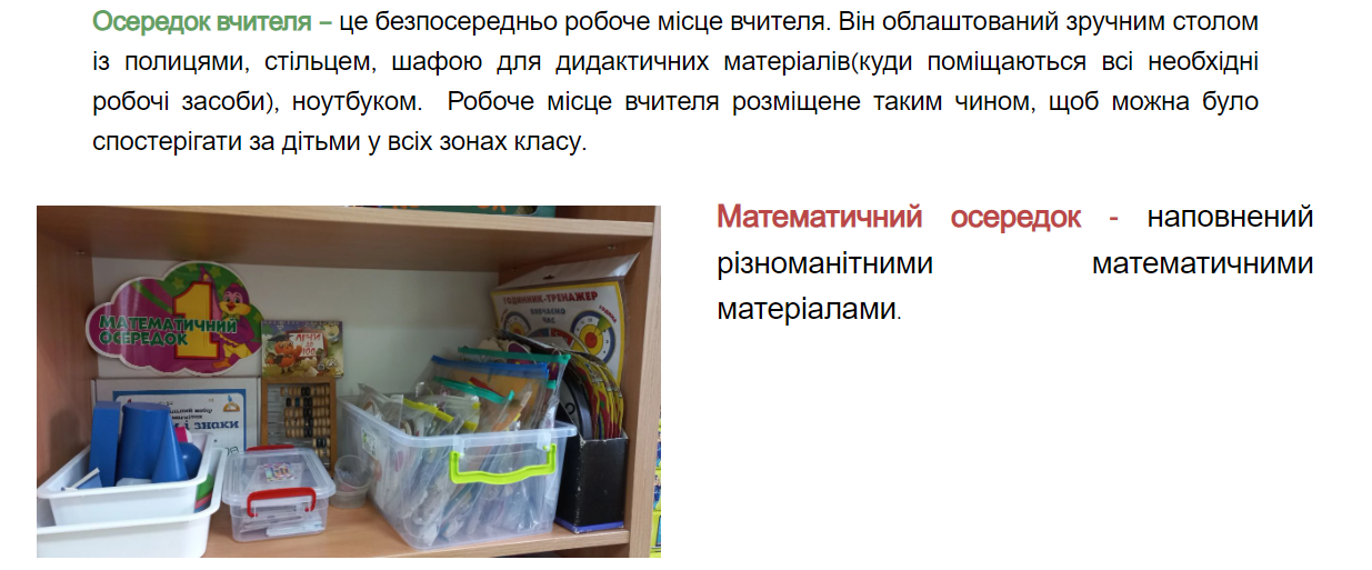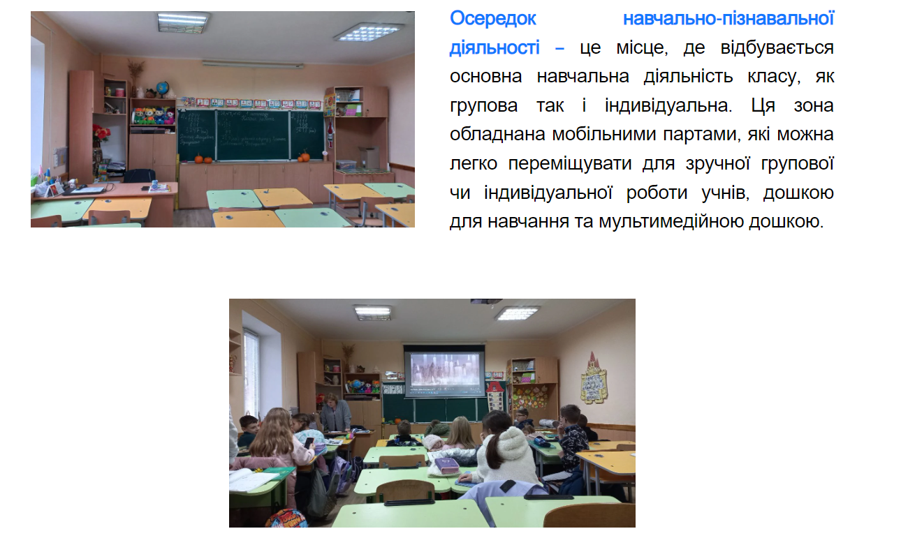 Освітній простір 2-Г класу умовно можна розділити на такі осередки: